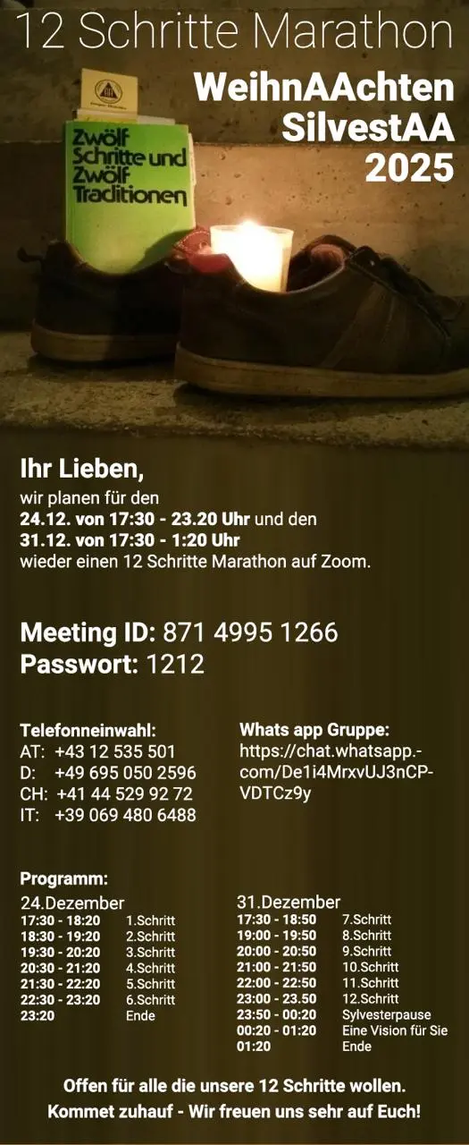 --->12 Schritte Marathon 24/31.12.2025<--- (bitte hier klicken), schreiben.Sehen oder hören wir uns ?Wie Ihr die Zoom- und oder die Telefoneinwahl am besten nutzt könnt ihr --->hier<--- (bitte hier klicken)Fragen? Dann schreibt einfach eine Nachricht an: christian.aa.audio@gmx.at <--- (bitte hier klicken) oder iron-okay-coyness@duck.com <--- (bitte hier klicken)Die Teilnahme an den Diensten ist freiwillig und ich möchte darauf hinweisen, dass ich nicht der Betreiber von WhatsApp, ZOOM oder Google bin.Diese Zoom Meetings werden im Rahmen der Selbsthilfegruppen realisiert, und es ist gewünscht, die Anonymität der anderen Teilnehmer zu wahren !Ihr entscheidet selbstständig und in der Eigenverantwortlichkeit, welche Informationen an die/den anderen Teilnehmer weitergegeben werden.Es sind keine professionelle Therapeuten oder Ärzte anwesend.Sollte es Dir nicht gut gehen, und die Teilnehmer in den Zoom Meetings können Dir die gewünschte bzw. erforderliche Hilfestellung nicht geben, kontaktiere dann bitte Deinen lokalen ärztlichen Notdienst.Es folgen mögliche AnsprechpartnerSeelsorge und BeratungFür Deutschland:(Online Informationen)<--- bitte hier klickenFür Österreich:(Online Informationen)<--- bitte hier klickenFür Schweiz:(Online Informationen) <--- bitte hier klickenInwiefern die hier publizierten Telefonnummern der Telefonseelsorge kostenpflichtig sind entzieht sich meiner Kenntnis.Bei Rückfragen klickt bitte den/die Link (s) "Online Informationen".Dies ist gesondert zu beachten !Danke !Beachtet wie immer auch, in diesem Zusammenhang, die Hinweise zum Datenschutz/Impressum<---(bitte hier klicken)Danke !Wenn ihr einen der hier aufgeführten Links klickt oder eine Email schreibt, dann verlasst ihr dieses Angebot und es gelten die AGB`s bzw. die Nutzungsbedingungen von WhatsApp, ZOOM, Google, Telefonseelsorge, jegliche andere Internetseiten, oder die Deines Email Anbieter (Provider).